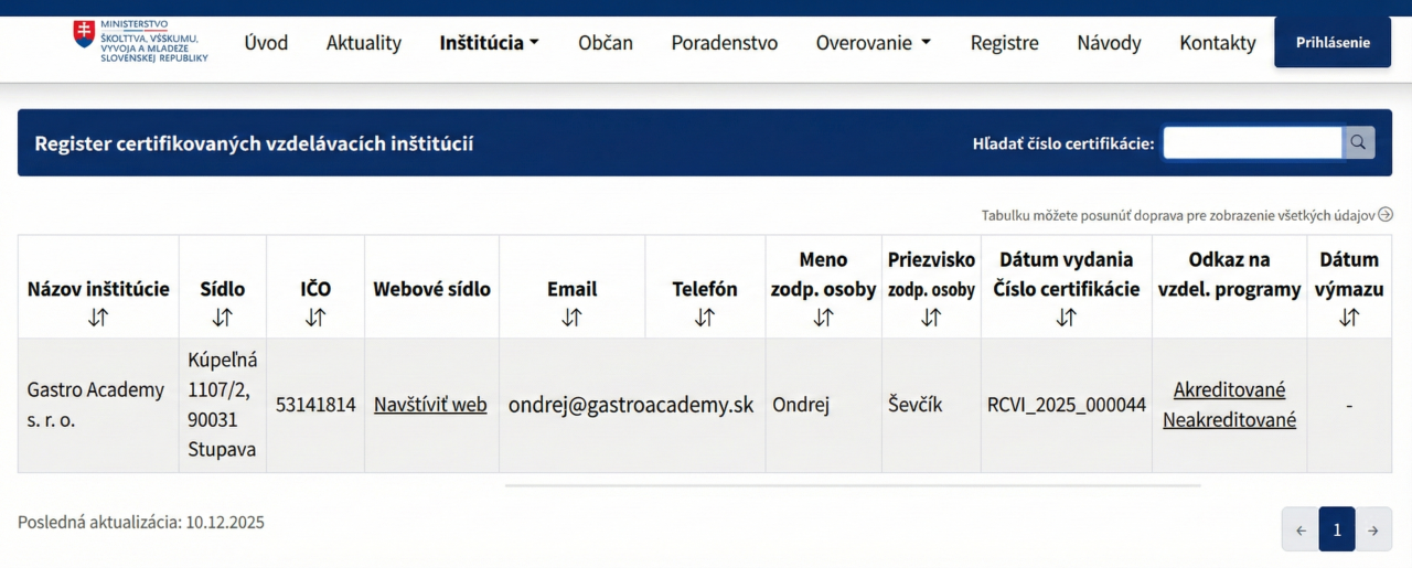 Kurz cukrár - cukrárka je akreditovaný Alianciou sektorových rád podľa najnovšieho zákona o vzdelávaní dospelých č. 292/2024 Z.z.. Gastro Academy s.r.o. je zároveň podľa tohto zákona "certifikovaná vzdelávacia inštitúcia". Po úspešnom absolvovaní kurzu získate "osvedčenie o absolvovaní akreditovaného vzdelávacieho programu", ktoré je vydané podľa §15 zákona č. 292/2024 Z.z..