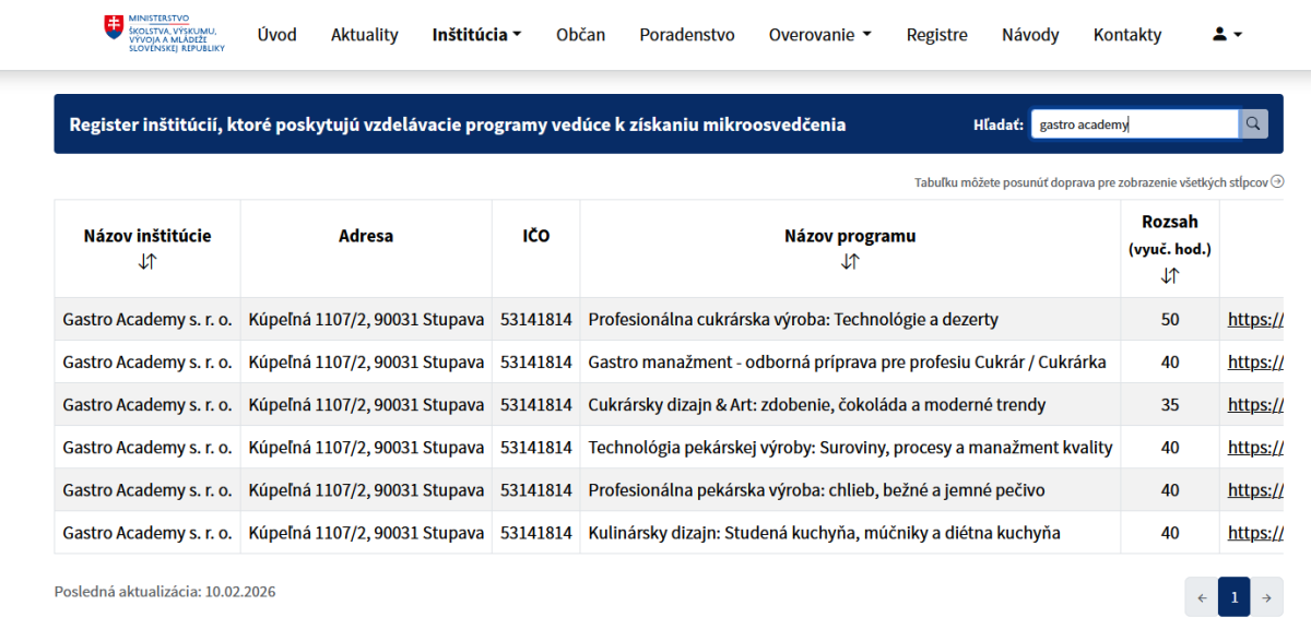 Kurzy Gastro Academy sú od 10.2.2026 zapísané v registri Ministerstva školstva SR a realizujeme ich na základe súhlasu a odborného posúdenia Strednej odbornej školy gastronómie a hotelových služieb, Farského, Bratislava.